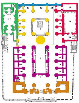 1.- Altar Mayor 2.- Coro y Sillería 3.- Trascoro 12.- Capilla Mayor