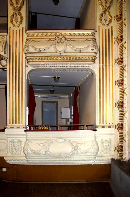 EL PATIO DE BUTACAS está coronado en su tercer piso con una galería de arcos deprimidos sostenidos por columnas. Los balcones del segundo y primer piso presentan decoración diferenciada, siendo el del primer piso de motivos vegetales encerradas en cartuchos y el del segundo de guirnaldas florales en semicírculos colgantes, siempre en yesería blanca con resaltes dorados. Los palcos de platea tienen igualmente molduras de yesería, pero en este caso sin ningún tipo de policromía. Los asientos, tanto en los palcos como la platea están tapizadas en granate, siendo del mismo color las cortinas que separan los espacios en los palcos y las que cubren las puertas de acceso.