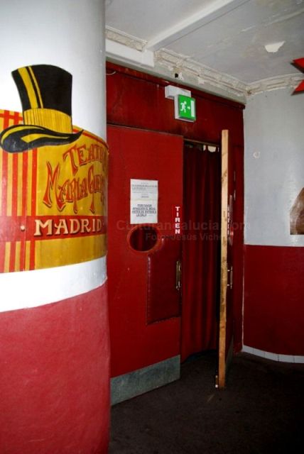Carteles cinematográficos entre bastidores. Lamparilla con restos del cableado eléctrico antiguo. Sobre la puerta, un letrero en el que se lee: "Cupletistas"